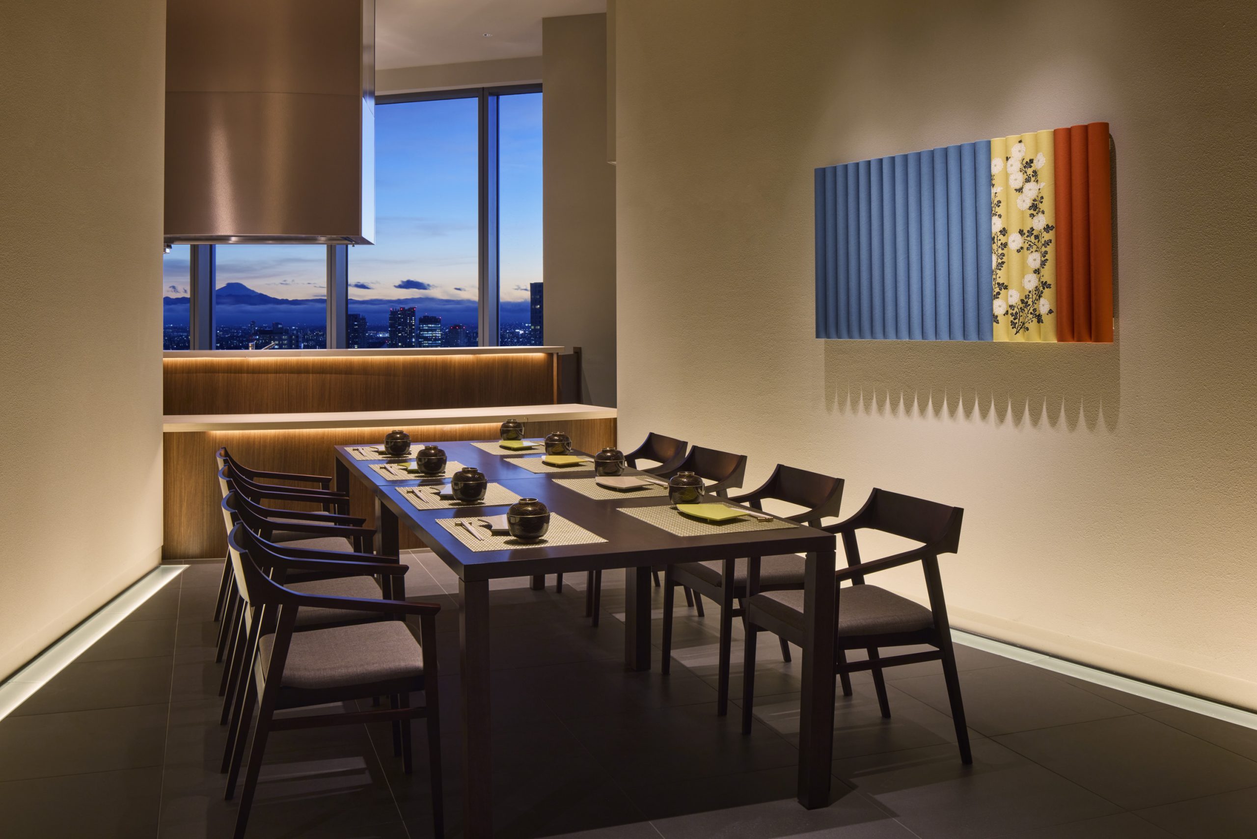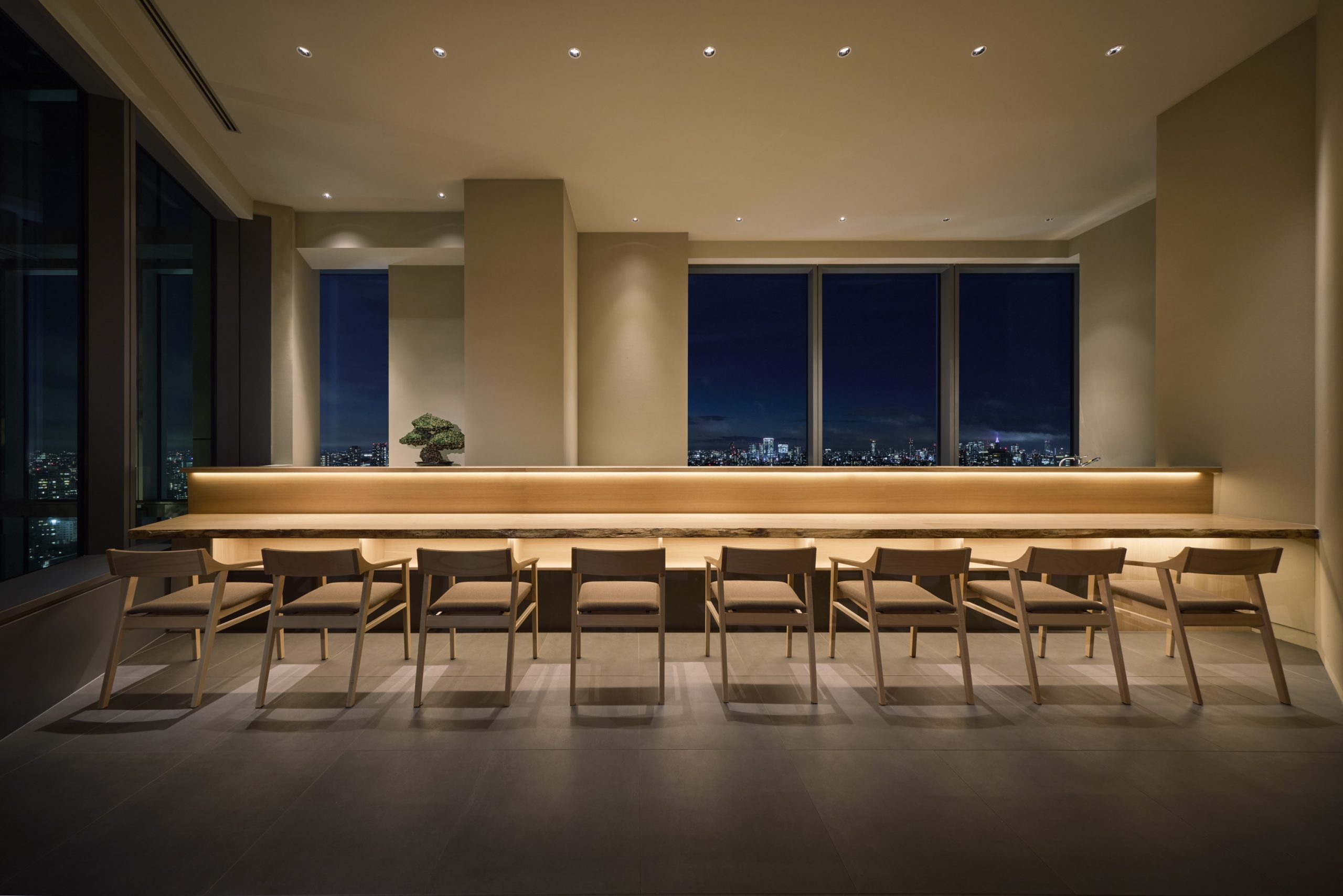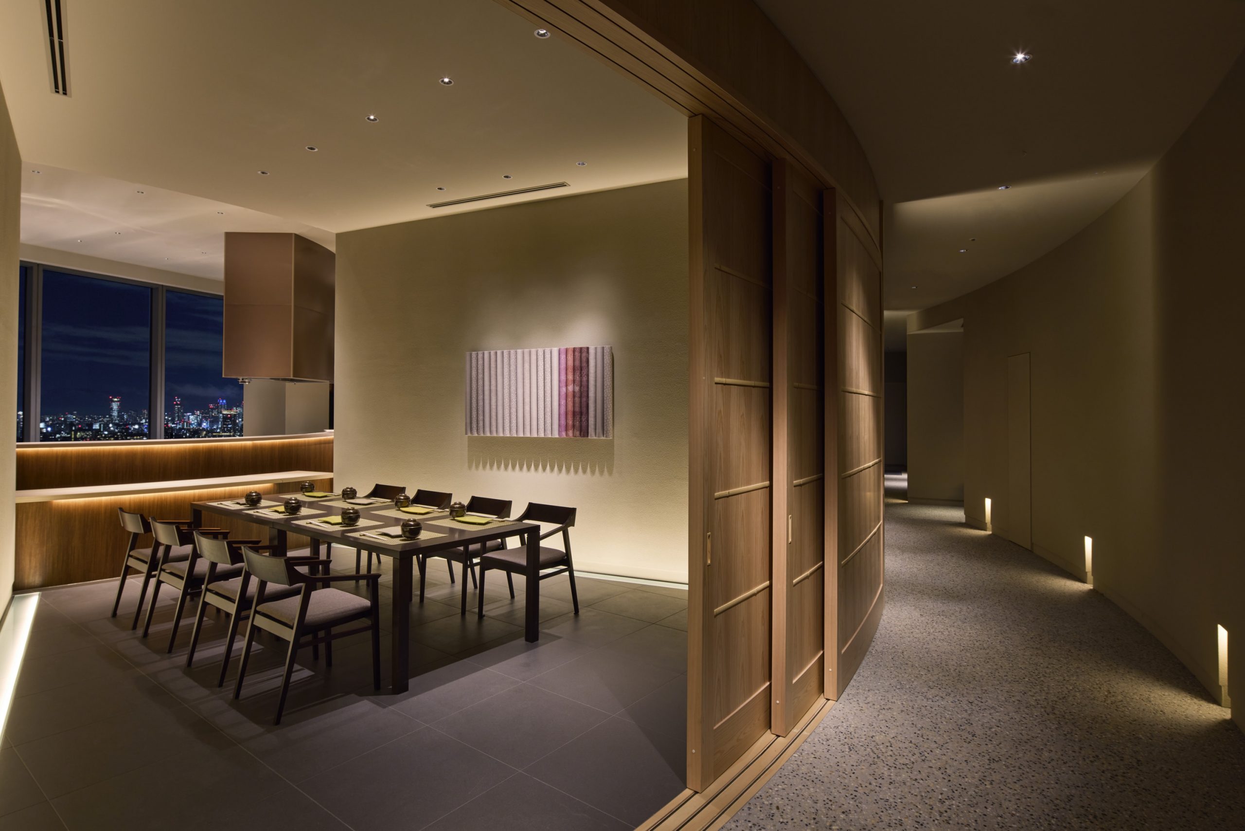 空間は、舞台をモチーフとした扇形が特徴的な構成を用い、割烹の伝統的なカウンター文化と現代的な個室空間の魅力を融合させています。オープンキッチン形式を採用し客席を一段上げることで、どの席からも目の前で料理人の巧みな手捌きや繊細なパフォーマンスが見え、料理を味わうだけでなく食を五感で楽しめる設計としました。個室とオープンキッチンの組み合わせは、静謐なプライベート感と料理人との距離の近さが共存する独自の設えです。キッチンの先には、施設の最上階に広がる”東京”の街を舞台の借景とする事で、日本の食文化の新しい魅力を発見できる、食の体験空間を目指しました。